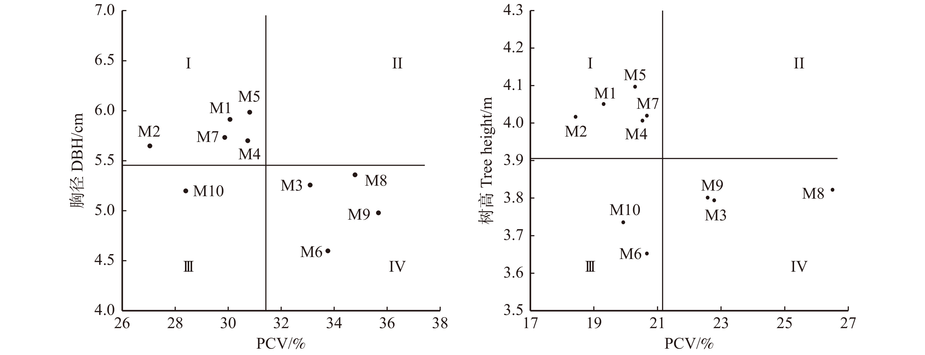 Method The DBH and tree height of 10 3-year-old Pinus massoniana clones (M1 − M10) were measured from regional experimental forest in Ningming County (E1), Liuzhou City (E2), Bobai County (E3) and Qinzhou City (E4) of Guangxi, southern China. The growth traits and phenotypic variation of different genotypes were analyzed. Clone stability analysis and comprehensive evaluation were carried out to screen excellent genotypes with high productivity and good stability.
