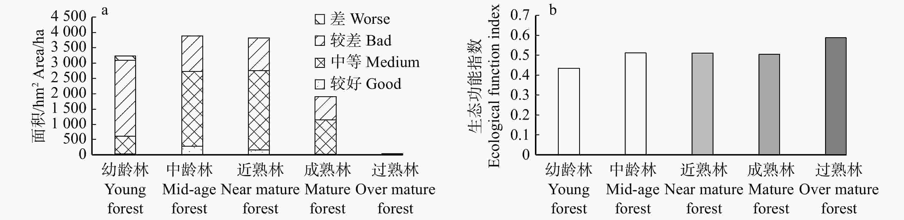 Result The forest ecological function index of Beimandian Forest Farm of Saihanba was 0.488, in which the stand with good ecological function grade accounted for 3.8%, the stand with medium ecological function grade accounted for 52.7%, the stand with bad ecological function grade accounted for 42.4% and the stand with worse ecological function accounted for 1.1%. The ecological function index of different stand origins was as follows: natural forest (0.545) > planted forest (0.474). The ecological function index of different forest types was as follows: mixed forest of needleleaf and broadleaf species (0.710) > mixed forest of broadleaf species (0.617) >Betula platyphylla natural secondary forest (0.535) > mixed forest of needleleaf species (0.487) > Larix principis-rupprechtii plantation (0.478) > Picea asperata plantation (0.443) > Pinus sylvestris var. mongolica plantation (0.429). The ecological function index of different age groups was as follows: over-mature forest (0.588) > middling forest (0.512) > near-mature forest (0.509) > mature forest (0.504) > young forest (0.434).