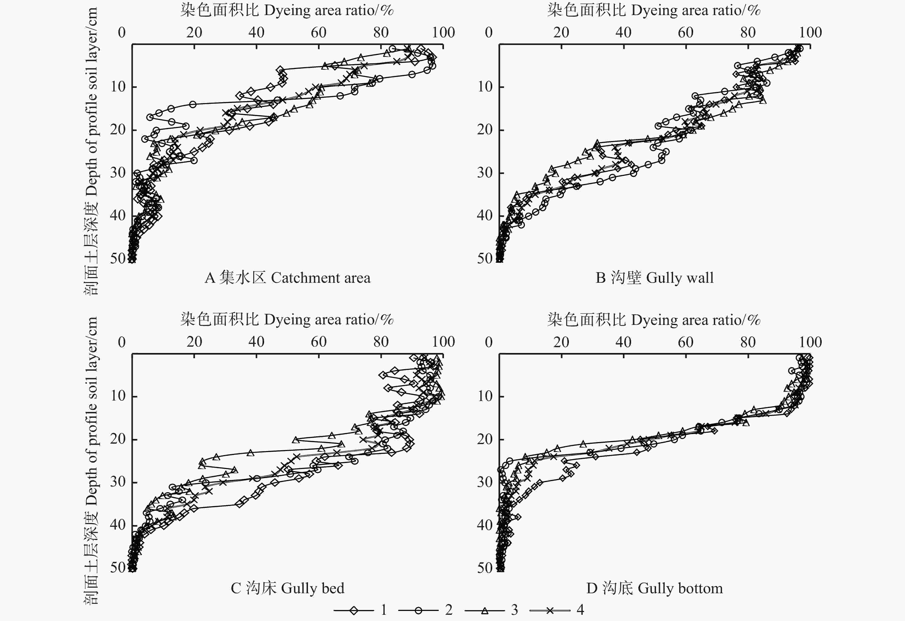 Method A complete gully in a typical gully development area of the dry hot valley was selected as the research object. Based on dye tracing, soil erosion resistance and soil physicochemical experiments, statistical analysis methods such as principal component analysis (PCA) were used to obtain the soil preferential flow, soil erodibility indicators and their correlations, clarify the soil preferential flow characteristics of the complete gully system at the catchment area, gully wall, gully bed and gully bottom, as well as explore the correlation between preferential flow and soil erodibility.