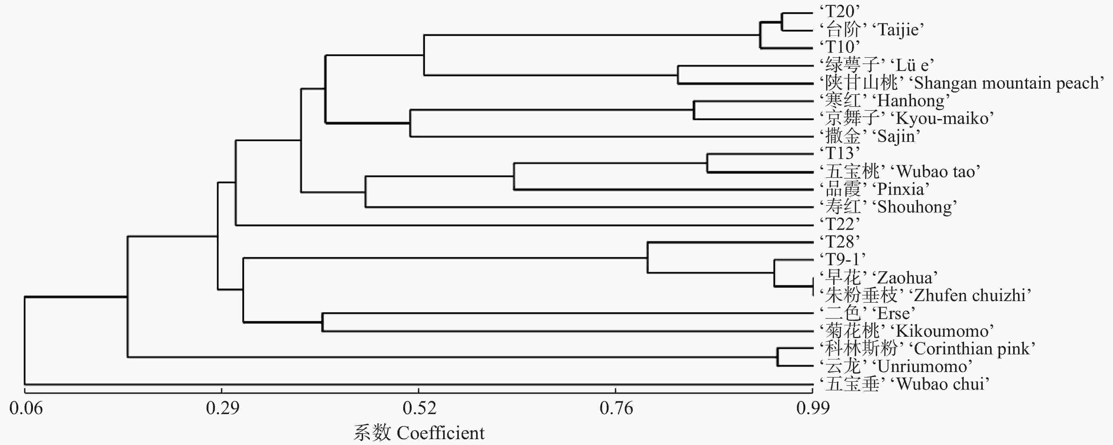 Result 36 pairs of highly polymorphic primers were screened from 29 pairs of primers. A total of 183 polymorphic alleles and 98.396 effective alleles were detected. Average of observed heterozygosity was 0.341, and average of expected heterozygosity was 0.739. Average of Shannon’s information index was 1.546, and average of polymorphism information content of primer was 0.683, ranging from 0.510 to 0.841. The new germplasm ‘T20’ and ‘T10’ had the largest similarity coefficients with the existing variety ‘Taijie’, which were 0.95 and 0.92, respectively. ‘T20’ and ‘Taijie’ had the same phenotypic traits, including branch shape, petal color and petal type. The new germplasm ‘T13’ and the existing variety ‘Wubao tao’ had the highest similarity coefficient, which was 0.86. Similarity coefficient between the new germplasm ‘T22’ and other existing varieties was very small, and its phenotypic characters were quite different from the other 21 germplasms. Similarity coefficient of the new germplasm ‘T9-1’ and ‘Zaohua’ with the existing variety ‘Zhufen chuizhi’ was the largest, which was 0.94.