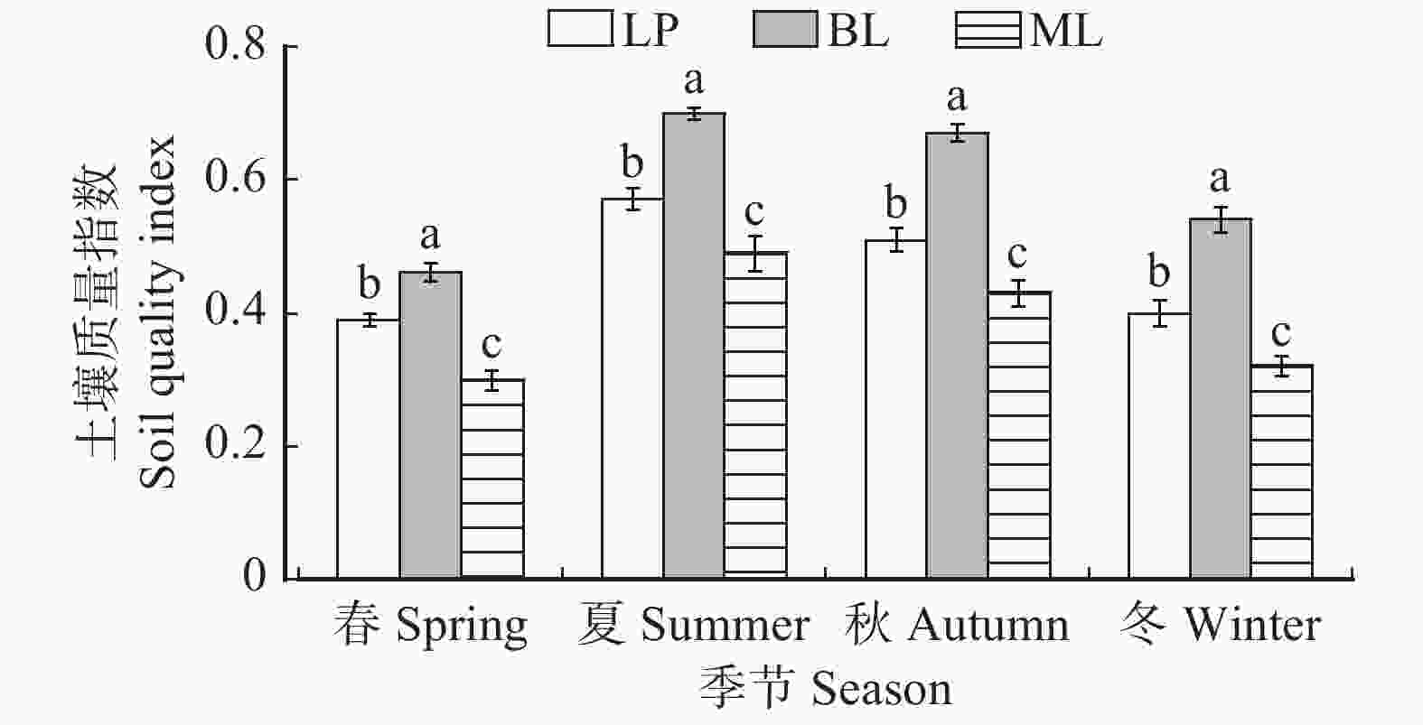 Method The pure Larix principis-rupprechtii stands (LP), mixed Larix principis-rupprechtii and Betula platyphylla stands (BL), and mixed Larix principis-rupprechtii and Pinus sylvestris var. mongolica stands (ML) were selected as the research objects in Saihanba Mechanical Forest Farm of Hebei Province, northern China. The soils of 0−20 cm soil depths were collected and analyzed to investigate the soil physicochemical and biological properties. SQI was used to evaluate soil fertility quality. SQI was determined in three steps by selecting a minimum data set (MDS) through principal component analysis, scoring the MDS indicators using non-linear scoring functions, and integrating the indicator scores into a SQI using the weighted additive equation.