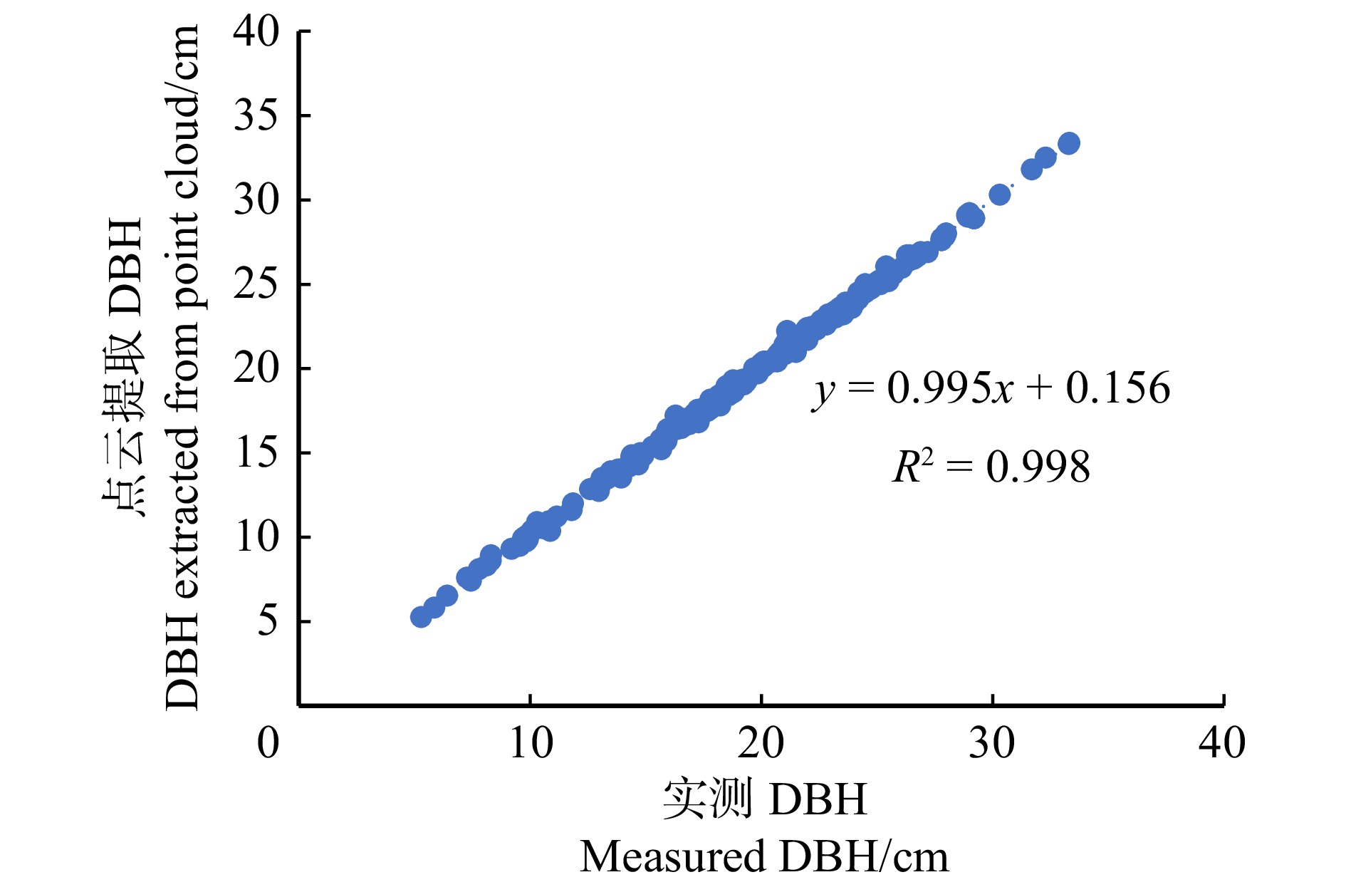 Conclusion For L. tulipifera plantation under the multi-density management, the yield of large-diameter timber in the open forest is the largest, while the small-diameter wood is the main diameter class in the dense forest. The single tree parameters obtained based on the ground laser point cloud could be intuitively studied for the forest manager, which has a positive impact on the improvement of the production and management level of the plantation and the improvement of the work efficiency of the forestry workers.